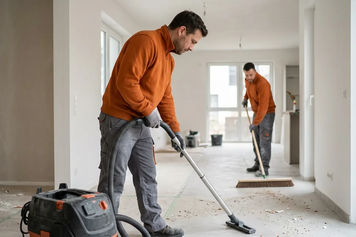 Staubarme Baustelle zwischen den Gewerken: Folienwechsel, Oberflächenschutz, regelmäßiges Saugen/Wischen, Sichtkontrolle problematischer Bereiche.